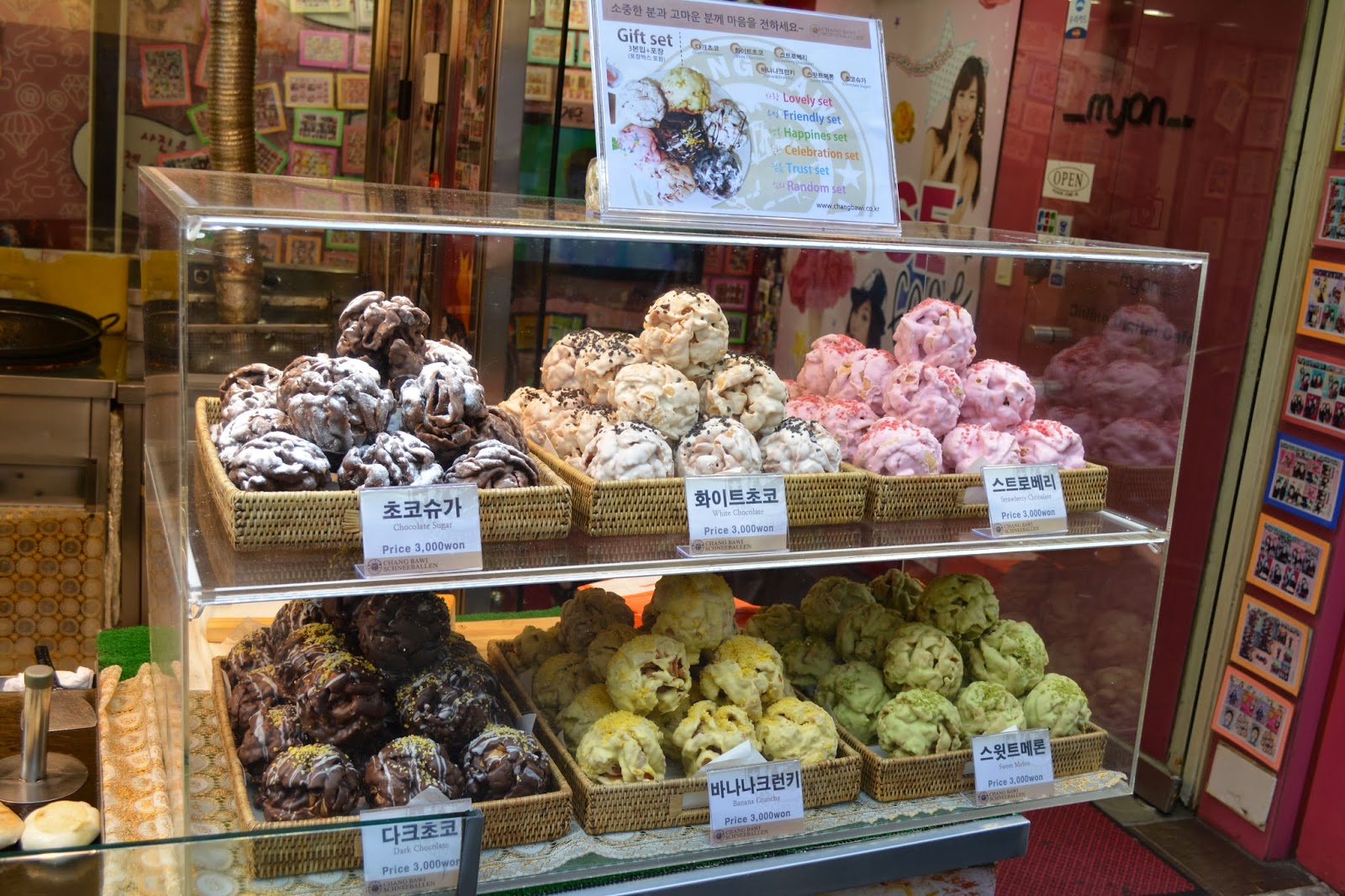 명동에는 많은 옷가게들과 음식점, 그리고 길거리 음식을 포함한 많은 음식점들이 있습니다.